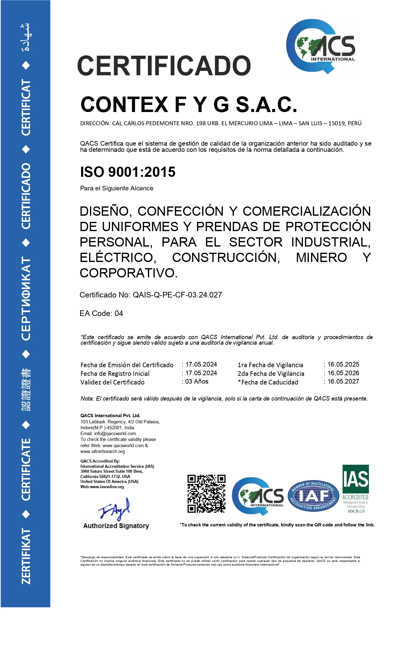 Esta certificación, otorgada por QACS Internacional Group de la India, garantiza la implementación de procedimientos de fabricación que cumplen con los estándares de calidad más exigentes para satisfacer las necesidades de todos sus clientes.